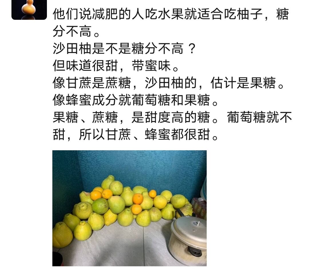 蜜柚呢,水分比沙田柚的多,成熟剛下樹的時候也很甜,帶點酸,吃的時候可能感覺不到酸,但吃了半個一個停下來的時候都會感覺牙齒有點酸。蜜柚,就中秋前后那時段適合吃,再遲點,掛樹上也好,摘下來存放倉庫也好,都會慢慢變得更酸。