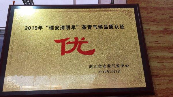 除了密切監(jiān)測天氣條件,2月份,氣象工作人員多次到高樓鎮(zhèn)的茶園勘查、取樣,協(xié)助合作社準(zhǔn)備材料,向省農(nóng)業(yè)氣象中心申報(bào)農(nóng)產(chǎn)品氣候品質(zhì)認(rèn)證。3月初,一場專門針對(duì)“瑞安清明早”的茶葉氣候品質(zhì)認(rèn)證會(huì)議在杭州召開。浙江茶葉協(xié)會(huì)研究員、省農(nóng)技推廣中心研究員、省科技開發(fā)中心和省氣象臺(tái)的研究員、教授、高工一起,參與評(píng)審,終認(rèn)定2019年3月瑞安市東甌清明早茶專業(yè)合作社聯(lián)合社生產(chǎn)的“瑞安清明早”茶青氣候品質(zhì)等級(jí)為“優(yōu)”。這是瑞安“清明早”茶葉第一次獲得氣候品質(zhì)的認(rèn)證。