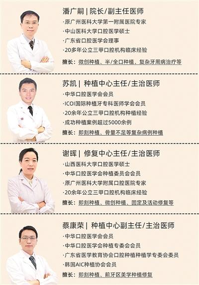 在口腔醫(yī)療機構(gòu)里,一名患者通常由一名主治醫(yī)師負(fù)責(zé),往往會出現(xiàn)傳統(tǒng)種植方案設(shè)計無法滿足患者需求或因醫(yī)生經(jīng)驗不足無法進行種植等問題。廣州暨博口腔 “疑難種牙特診小組”聚集了多名有三甲醫(yī)院口腔科工作經(jīng)驗的名醫(yī),潘廣嗣院長、蘇凱主任、謝暉主任等臨床經(jīng)驗均在20年以上、種牙超過10000顆,在數(shù)字化種植、疑難復(fù)雜種植方面經(jīng)驗豐富,專業(yè)為每一位患者提供每一顆牙的病例討論,嚴(yán)把質(zhì)量關(guān)。