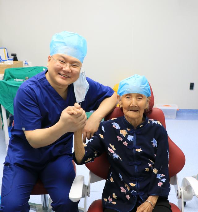 ▲“高齡種”專家、種植領(lǐng)軍專家王玉法博士術(shù)后與患者的合影