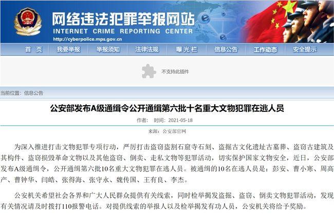 澎湃新聞?dòng)浾咦⒁獾剑鲜觥稒z察日?qǐng)?bào)》報(bào)道提到的曹某華,即2021年公安部發(fā)布A級(jí)通緝令公開通緝十名重大文物犯罪在逃人員之一的曹鐘華。通緝令顯示,曹鐘華,男,1984年12月8日出生,戶籍地:安徽省宣城市宣州區(qū)貍橋鎮(zhèn)南湖村沙溪組33號(hào)。