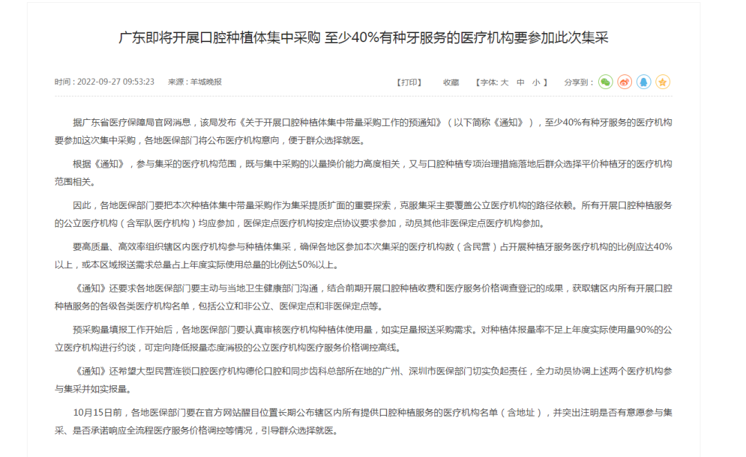 而身居全國(guó)第三大口腔市場(chǎng)的廣東省,在9月21日也發(fā)布了《關(guān)于開展口腔種植體集中帶量采購(gòu)工作的預(yù)通知》,文中明確要求各地醫(yī)保部門“要高質(zhì)量、高率組織轄區(qū)內(nèi)醫(yī)療機(jī)構(gòu)參與種植體集采,各地區(qū)參加本次集采的醫(yī)療機(jī)構(gòu)數(shù)(含民營(yíng))占開展種植牙服務(wù)醫(yī)療機(jī)構(gòu)的比例應(yīng)達(dá)40%以上”。