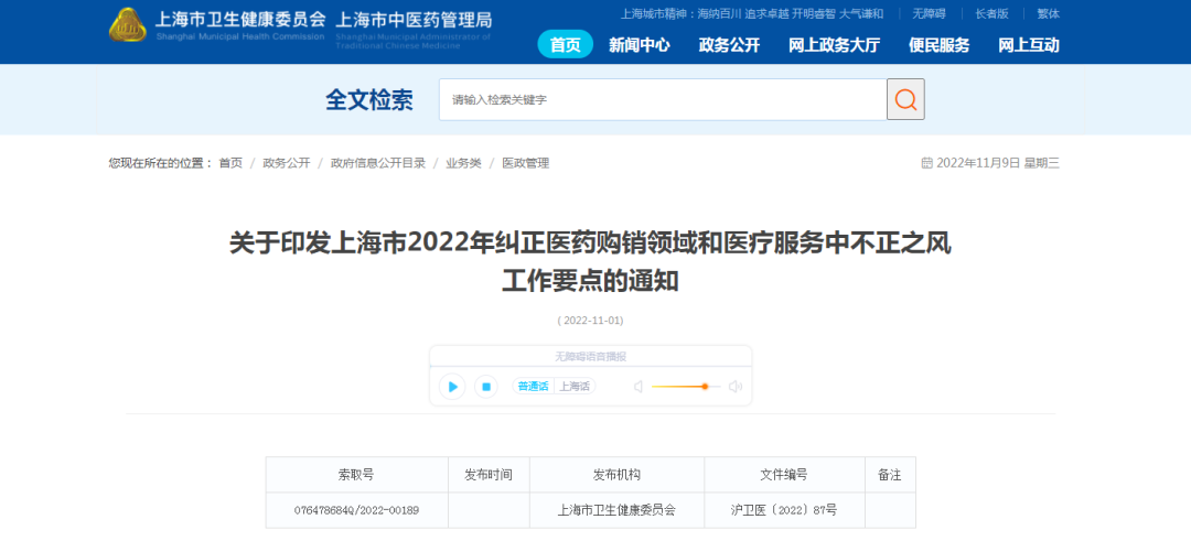 《關(guān)于印發(fā)上海市2022年糾正醫(yī)藥購(gòu)銷領(lǐng)域和醫(yī)療服務(wù)中不正之風(fēng)工作要點(diǎn)的通知》地址:http://wsjkw.sh.gov.cn/yzgl3/20221101/044ce68c34cc4c51b3e0fd0d6b4adcfc.html
