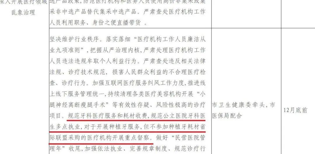 “規(guī)范牙科醫(yī)療服務(wù)和耗材收費(fèi),規(guī)范公立醫(yī)院牙科醫(yī)生多點(diǎn)執(zhí)業(yè),對(duì)于開展種植牙服務(wù),但不參加種植牙耗材省際聯(lián)盟采購(gòu)的醫(yī)療機(jī)構(gòu)開展重點(diǎn)督察?!?/span>