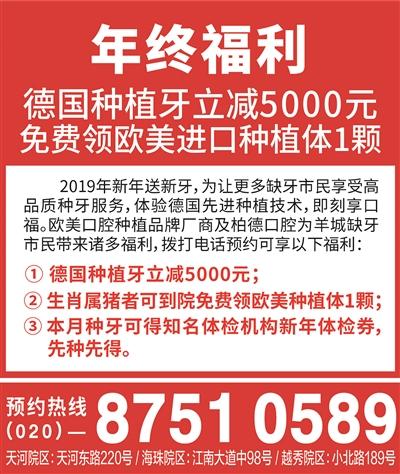 由歐美各大口腔種植品牌廠商聯(lián)合柏德口腔共同發(fā)起的“千人種牙團(tuán)購會”活動(dòng)在羊城火熱進(jìn)行中。據(jù)悉,團(tuán)購會齊聚數(shù)十位國際口腔醫(yī)學(xué)博士,為羊城缺牙市民帶來德國種植技術(shù)——當(dāng)天種當(dāng)天用,受到缺牙市民的好評。為了惠及更多缺牙市民,2019年新年期間,“千人種牙團(tuán)購會第3期”盛大開啟。屆時(shí)中德院長將現(xiàn)身為缺牙市民解答疑惑,歐美各大口腔種植品牌廠商新年送福利。撥打電話020-8751 0589免費(fèi)領(lǐng)萬元福袋,更有德國種植牙代金券5000元。