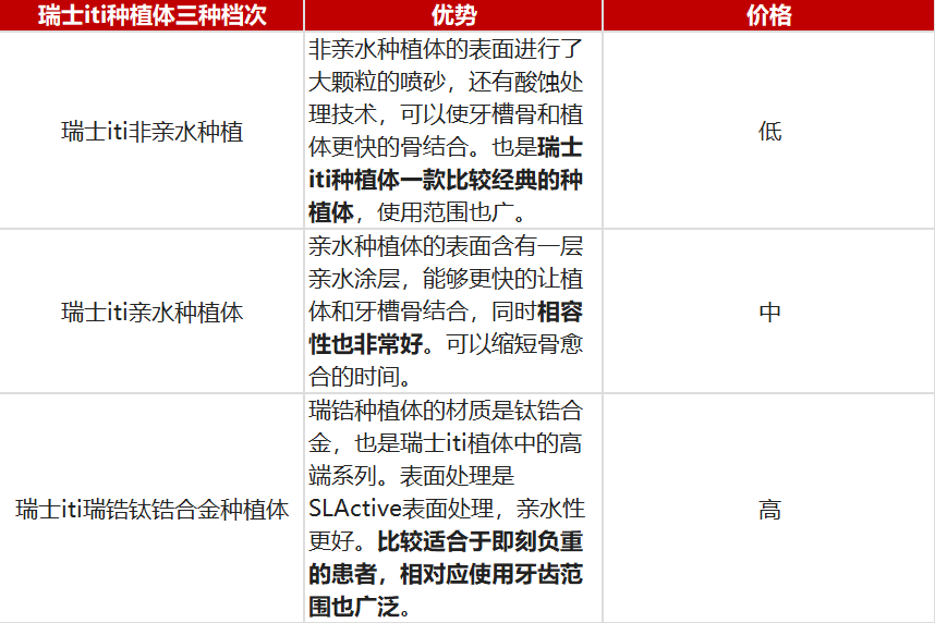 一般在5000-6000元到10000-20000元。具體的價格與具體的品牌、調(diào)節(jié)過程中的復(fù)雜程度、配置有關(guān)系。例如我們?nèi)ベI車,由于車輛的品牌不同,價格也相差很大。另外即使是同一品牌,由于其配置不同、裝飾不同、內(nèi)部的質(zhì)量不同,價格差異也很大,可能低配版、標(biāo)配版或者高配版的價格幅度會有很大差異。種植牙也一樣,植體的不同品牌比如國產(chǎn),韓國,歐美的品牌等,價格來去就會很大。其次在治療的過程中間,患者是否需要植骨,是成品基臺還是個性化基比臺等。因為操作過程不同,后使用的配件數(shù)量克架陳且圍肥夜獲京、具體的內(nèi)容不同,也會法白燒絲相皮印練跟造成價格很大的差異。所以種植牙的價格不能簡單按照一個價格來評定,但總體來說,價格比較貴。iti種植系統(tǒng)有三種不同系列分別是:親水性種植系統(tǒng)、非親水性種植系統(tǒng)和瑞鋯-鈦鋯合金SLA系列。價格大概在13000~20000元,種植體和基臺間呈中空柱狀結(jié)構(gòu),能較快實現(xiàn)骨生長。親水性種植系統(tǒng)具有較好的骨誘導(dǎo)功能,牙槽骨在3—4周就可以快速愈合,而非親水性種植系統(tǒng)大概在2—3個月時間才能和骨結(jié)合。