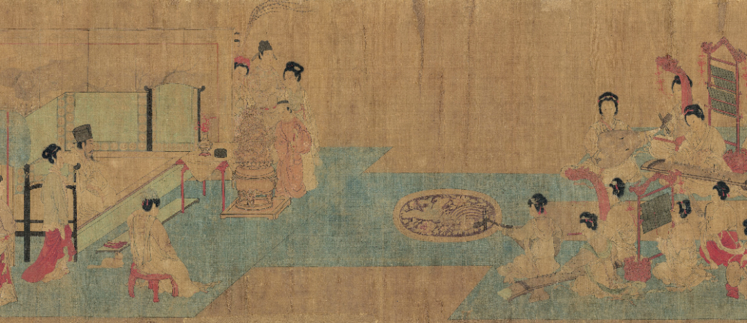 傳南唐周文矩《合樂圖》局部,表現(xiàn)朱門顯貴欣賞歌姬演樂的情景。此畫畫心右側(cè)有宋徽宗瘦金書體題名“唐周文矩合樂圖無上神品也”,又有宋理宗“緝熙殿寶”一枚,均偽。然此畫從畫風(fēng)及人物衣著服飾來看,當(dāng)出自宋人手筆,或反映的是宋人的娛樂生活。