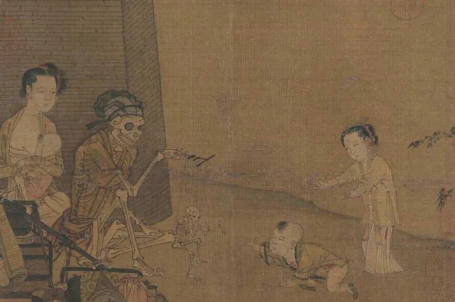《骷髏幻戲圖》局部,象征死亡的骷髏用牽線傀儡吸引小孩兒奔向死亡。