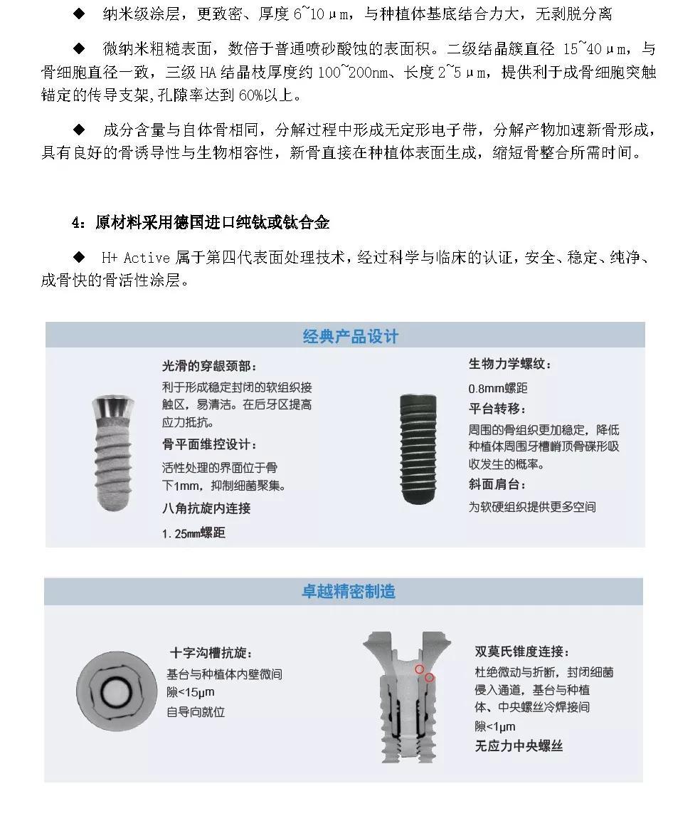 再者種植體植入后為了能在你的口腔環(huán)境內(nèi)長期、穩(wěn)定、的使用,表面處理起到了至關(guān)重要的作用。具有多級微、納米結(jié)構(gòu)且親水性良好的生物活性表面種植體,可獲得結(jié)合強度更高、愈合周期更短、穩(wěn)定性更佳的骨結(jié)合果。