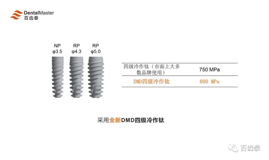 百齒泰種植體選用創(chuàng)新的DMD四級冷作鈦,相比同類材料中,具備高生物相容性與更高的機械強度。