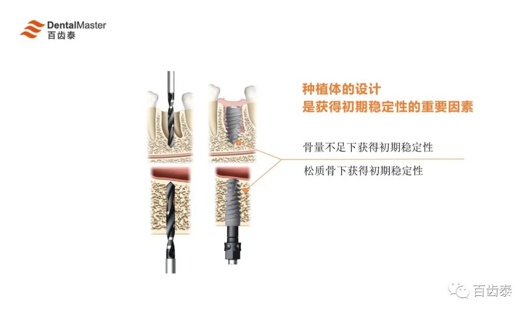 百齒泰種植體的外形設(shè)計,能通過垂直、水平雙向獲得骨擠壓;頂端鉆刃可利用較小植入路徑,亦可提高骨擠壓果,獲得高初期穩(wěn)定性。