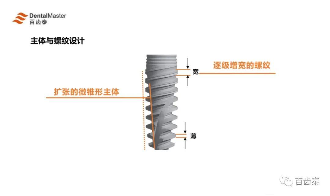 微錐主體:螺紋設(shè)計使植入更加順利,易獲得較好的初期穩(wěn)定性;