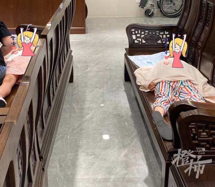 22點(diǎn)44分,在門(mén)口候診區(qū)睡著的兩個(gè)小女孩