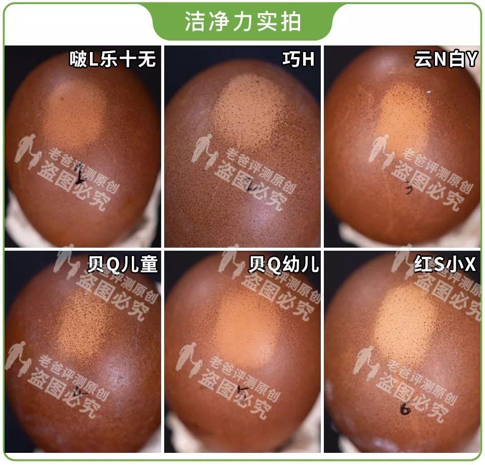 之所以選擇用茶雞蛋代替牙齒進(jìn)行實(shí)驗(yàn),是因?yàn)殡u蛋殼與牙齒的釉質(zhì)一樣,大部分都是由無機(jī)物組成。釉質(zhì)有凹陷處,而雞蛋有孔縫,兩者都會附著茶垢等成分。當(dāng)然,這個實(shí)驗(yàn)僅代表一部分的潔凈力,不能確定在孩子牙齒上也有同樣的表現(xiàn),實(shí)驗(yàn)結(jié)果僅供參考。