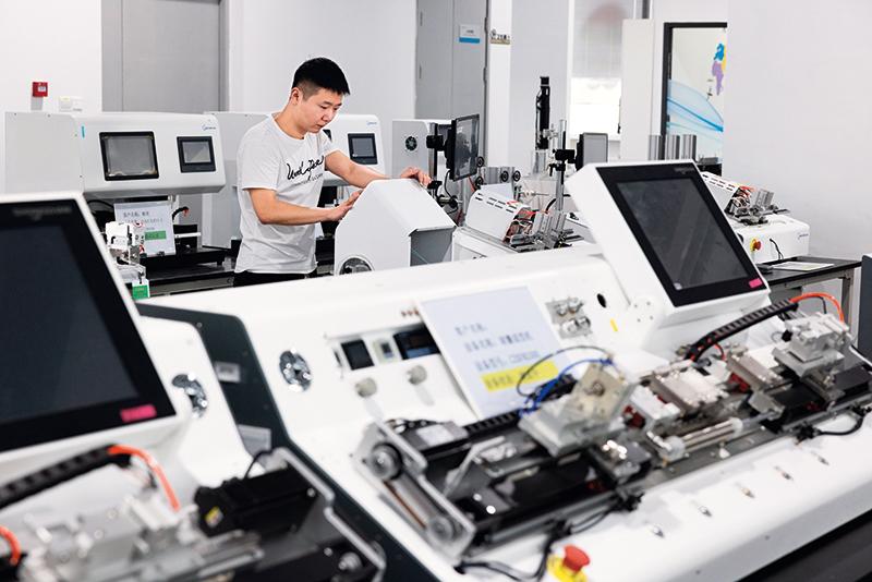 在中國(guó)(上海)自由貿(mào)易試驗(yàn)區(qū)臨港新片區(qū)生命科技產(chǎn)業(yè)園一處醫(yī)療設(shè)備生產(chǎn)車間,工人調(diào)試醫(yī)療設(shè)備(2022年8月18日攝) 金立旺攝/本刊