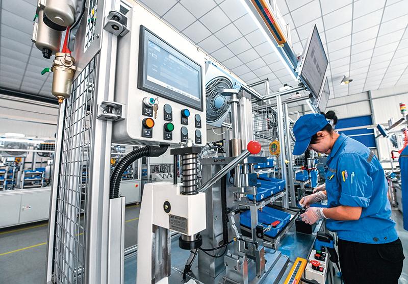 在位于浙江諸暨市店口鎮(zhèn)工業(yè)區(qū)的浙江萬(wàn)安科技股份有限公司數(shù)字化車間內(nèi),工人在檢測(cè)產(chǎn)品(2022年9月27日攝) 徐昱攝/本刊
