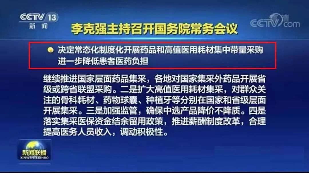 據(jù)新華社報(bào)道,國(guó)務(wù)院總理1月10日主持召開國(guó)務(wù)院常務(wù)會(huì)議,決定常態(tài)化制度化開展藥品和高值醫(yī)用耗材集中帶量采購(gòu),進(jìn)一步降低患者醫(yī)藥負(fù)擔(dān)——其中,對(duì)群眾關(guān)注的骨科耗材、藥物球囊、種植牙等分別將在和省級(jí)層面開展集采。