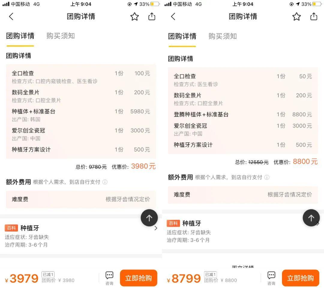 同一家口腔醫(yī)院不同韓國(guó)進(jìn)口品牌種植牙價(jià)格差異。圖/美團(tuán)