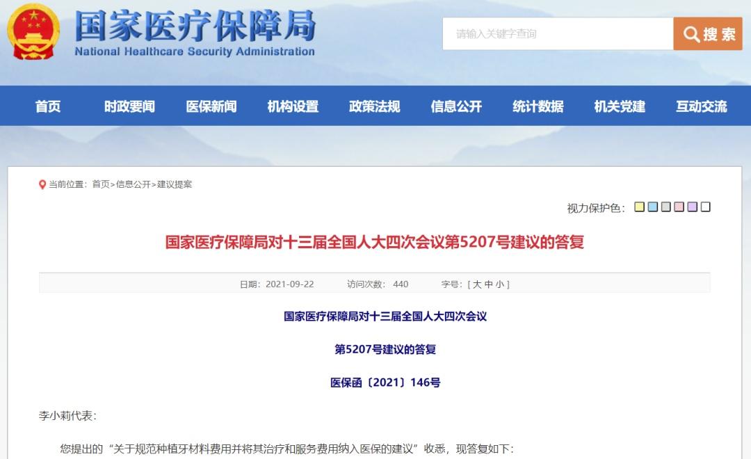 在回應(yīng)全國(guó)人大代表李小莉“將種植牙材料費(fèi)用納入醫(yī)保”的建議時(shí),醫(yī)保局明確表示,將按照《治理高值醫(yī)用耗材改革方案》的精神,及時(shí)將符合條件的耗材和診療項(xiàng)目納入醫(yī)保支付范圍。
