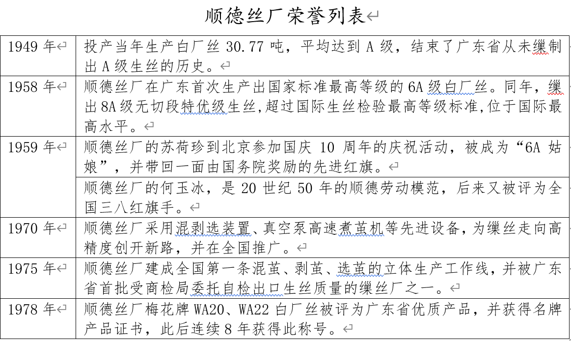 投產(chǎn)當(dāng)年,順德絲廠就生產(chǎn)白廠絲30.77噸,平均達(dá)到A級,結(jié)束了廣東省從未繅制出A級生絲的歷史。1958年,繅出8A級無切段特優(yōu)級生絲,超過國際生絲檢驗(yàn)高等級標(biāo)準(zhǔn),達(dá)到國際高水平。