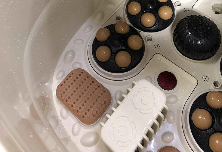這就是一款典型的泡腳+按摩的足浴盆了,機(jī)身內(nèi)部有6個按摩滾輪和2個振動板,前腳掌、腳心、腳跟都能按摩到,腳底的多個穴位也都能受到刺激,起到養(yǎng)生保健的作用;并且還有氣泡噴出口,開啟之后就會有大量氣泡沖擊腳底,泡腳也會更加舒服。泡腳功能自然是基本的了,750W加熱管擁有10重防觸電措施,恒溫加熱能讓洗腳水的溫度恒定,合適的水溫才好舒適的“腳感”。