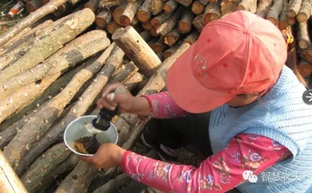 人工接種是栽培黑木耳成敗的關鍵工序,也是新法栽培大的特點。接種時間,一般以氣溫穩(wěn)定在15℃以上,有利于黑木耳菌絲生長的時候。具體時間因各地氣候條件不同而有差異,南方各省約在3~4月間。適當提早接種,有利早發(fā)菌,早出耳,同時早期接種氣溫低,可減少雜菌,害蟲的感染。接種前,先將段木表面清洗,再放陽光下曬2~3小時后備用。人工接種常用的菌種有木屑菌種、樹枝菌種和楔形木塊菌種。接木屑和樹枝菌種的,要用電鉆或直徑11~12毫米的皮帶沖 打孔,穴探15~2厘米。一般縱向種穴間距離10~12厘米,橫向種穴間距離為4~6厘米。如適當密植,把縱向種穴間距離縮短至6~7厘米,有利于發(fā)菌和提高產量。行與行的穴交 錯成品字形或梅花形排列。木屑菌種要塞滿穴,外加比接種穴直徑大2毫米的樹皮蓋,蓋平、蓋緊,以防菌種干燥。接樹枝菌種的,種木要與耳木平貼。打穴、接種、蓋蓋等要連續(xù)作業(yè),以保持接種穴、菌種和樹皮蓋原有的濕度,才有利于菌種的成活。采用楔形木塊菌種的,要用接種斧或木工鑿,在段木上砍鑿成45°角2厘米深的接種口,然后用小鐵錘將楔形木塊菌種打入接種口,錘緊、錘平。