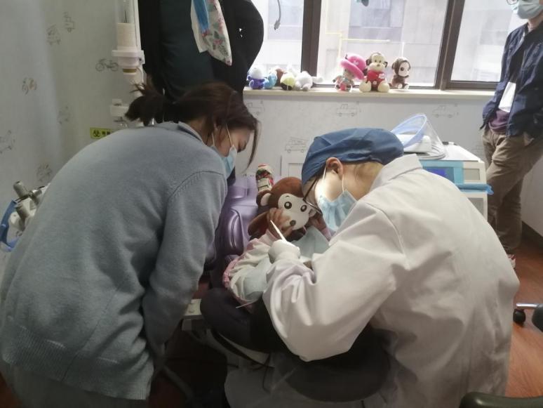 一旁的護(hù)士小姐姐趕緊把牙椅上方的播放器(名稱待定)打開,播放動(dòng)畫片,把玩具小猴子放到小女孩手上,順利吸引了孩子的注意力,安撫了孩子的緊張,這時(shí)的趙醫(yī)生已經(jīng)準(zhǔn)備好手機(jī),溫柔地說,"來,張開嘴哦,讓阿姨看看你的小牙齒里面有沒有小蟲子哦,"