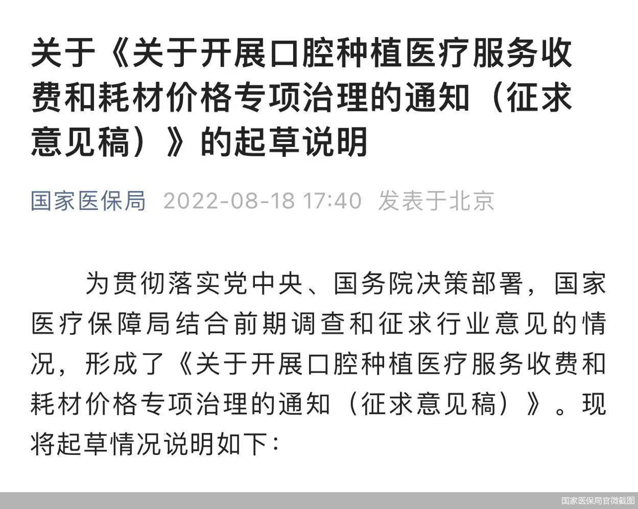 8月18日,醫(yī)療保障局就《關(guān)于開展口腔種植醫(yī)療服務(wù)收費(fèi)和耗材價(jià)格專項(xiàng)治理的通知(征求意見稿)》(以下簡稱《意見稿》)公開征求意見?!兑庖姼濉窂囊龑?dǎo)種植牙牙冠形成合理價(jià)格,到規(guī)范整合口腔種植價(jià)格項(xiàng)目等十二個(gè)方面面向社會(huì)公開征求意見,截止時(shí)間為2022年8月27日。長期以來,口腔種植領(lǐng)域收費(fèi)不規(guī)范、費(fèi)用負(fù)擔(dān)重,成為困擾群眾的民生痛點(diǎn)。隨著《意見稿》的披露,種植牙集采箭在弦上。