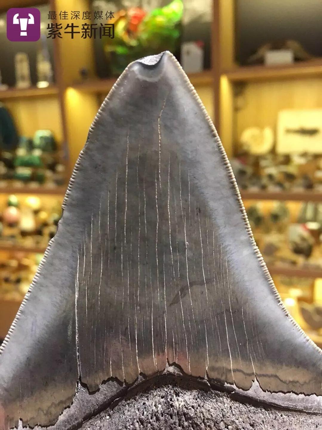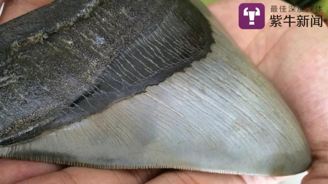 江泓向紫牛新聞記者展示了一顆成年巨齒鯊牙齒的化石,可以看見牙齒化石呈現(xiàn)灰藍色,還有黛色和奶油色的牙釉質(zhì),邊緣有很多密集的鋸齒結(jié)構(gòu),可以幫助巨齒鯊在捕獵時切斷鯨肉,并且巨齒鯊的攻擊力極強,水下運動速度迅猛,因而被稱為海洋中的強生物。