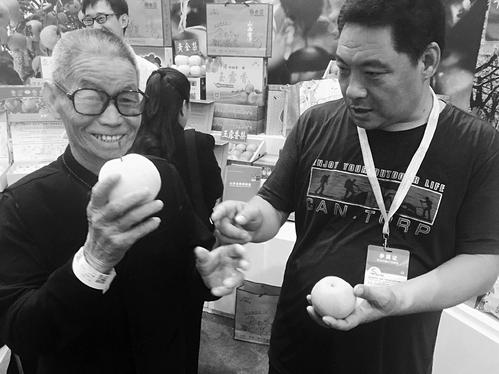 郭殿旗(右)在農(nóng)博會上推介鹽湖酥梨和玉露香梨。