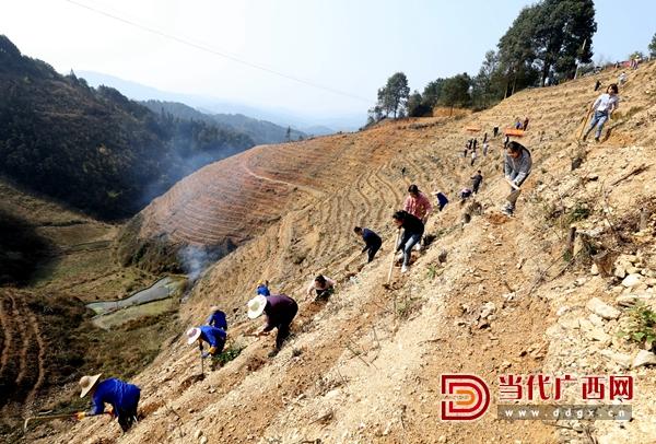 三江侗族自治縣林溪鎮(zhèn)的干部職工與村民們在“牙己茶”示范基地栽種新茶苗。通訊員 吳練勛 攝