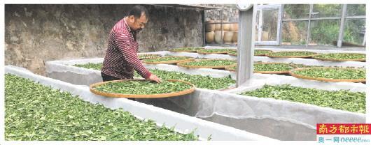 大雨初歇,滿山青翠。茶場主人朋伯帶領南都記者參觀茶場里的茶廠。雖然條件簡單,但茶廠的設備一應俱全。朋伯說,茶場與廣東科貿職業(yè)學院長期合作,學校每年安排茶藝專業(yè)學生來此實習。此時在茶廠正有一名女生林月春,主要負責茶葉揉捻、干燥工序。走水、萎凋、揉捻、悶黃、發(fā)酵、干燥,制作白云紅茶、黃茶的工序有很大區(qū)別,使用機器也不盡相同。紅茶干燥三次,每一次的溫度不同。林月春和朋伯將茶葉在竹篾團上攤薄,再放入機器中進行干燥處理。溫度是110攝氏度。
