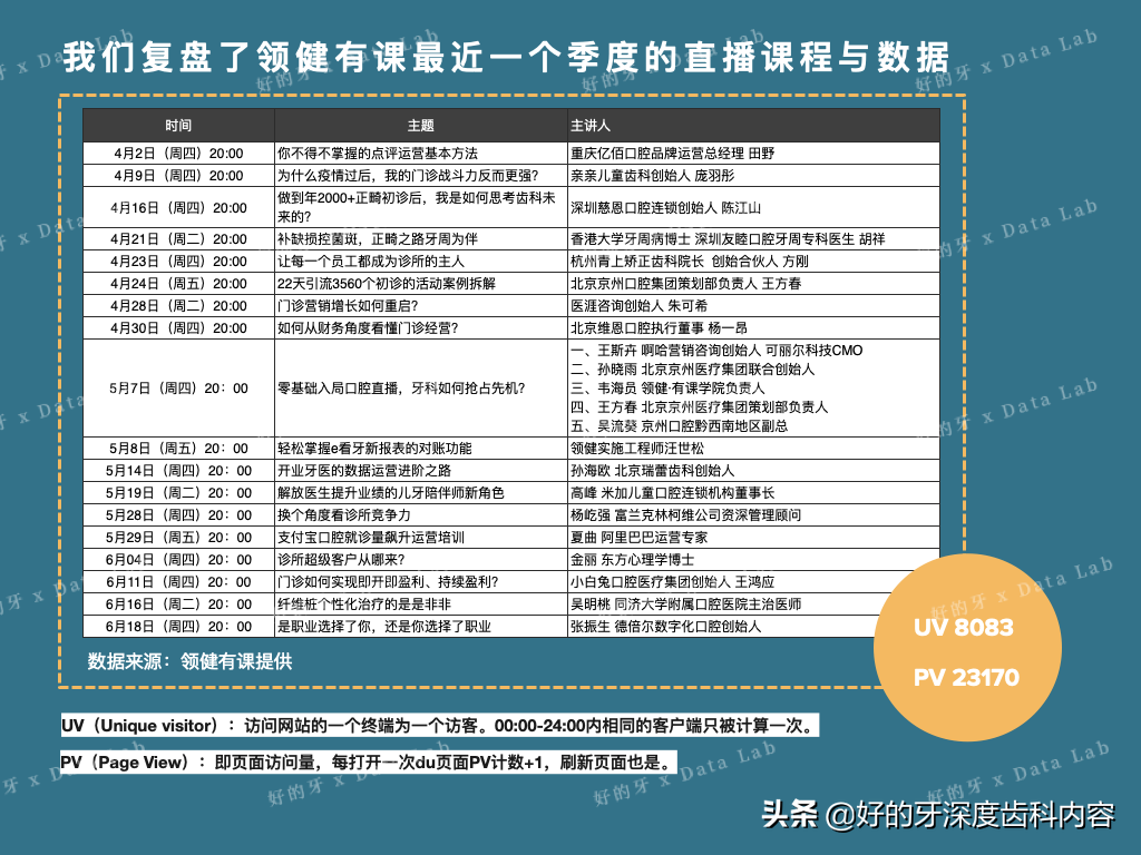 在線專業(yè)性齒科教育平臺,如“領(lǐng)健有課”也乘勢而上,不斷優(yōu)化課程內(nèi)容、審核機制,以及進行高頻直播操練。