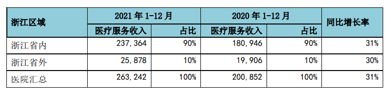 多年來,通策醫(yī)療的業(yè)務(wù)大部分依賴浙江省內(nèi),省外收入占比極小。2021年年報(bào)顯示,浙江區(qū)域收入占九成。
