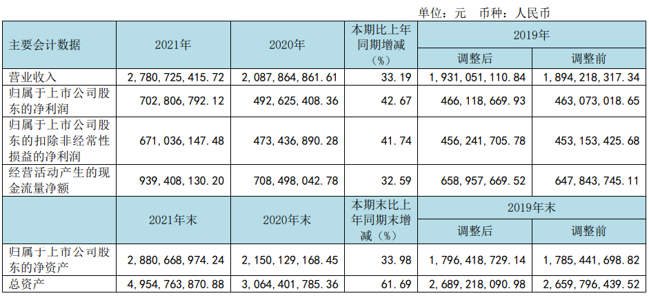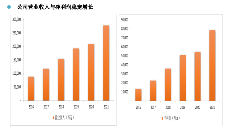 2021 年,公司營(yíng)業(yè)收入 278,073 萬元,比上年同期增長(zhǎng) 33.19%;凈利潤(rùn) 78,615.01 萬元,比上年同期增長(zhǎng) 44.26%。