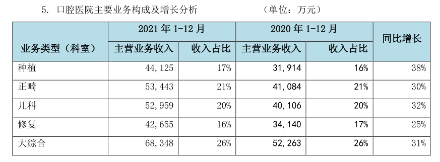 而據(jù)通策醫(yī)療2021年年報(bào),2021年種植業(yè)務(wù)收入44,125萬元,占主營(yíng)業(yè)務(wù)收入17%,同比增長(zhǎng)38%。