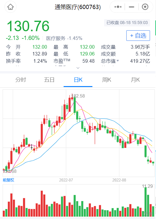 通策醫(yī)療股價(jià)高峰時(shí)超420元/股,但截至發(fā)稿前8月18日股價(jià)已下跌至130.76元/股,市值從頂峰已經(jīng)跌去近七成,市值蒸發(fā)900億。
