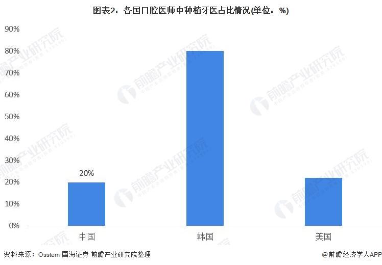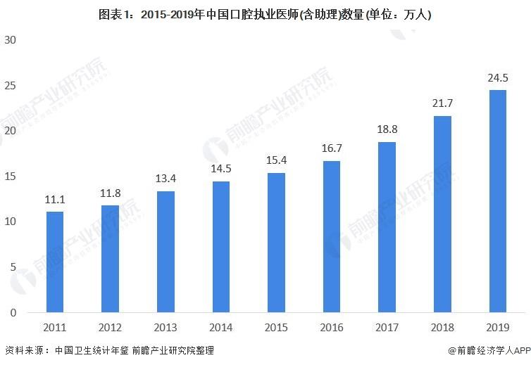種植牙醫(yī)的數(shù)量影響種植牙市場供給。近年來我國口腔執(zhí)業(yè)醫(yī)師數(shù)量大幅逐年增加,從2011年的11.1萬人增長到2019年的24.5萬人。根據(jù)數(shù)據(jù)顯示,我國口腔醫(yī)師中掌握種植牙技能的醫(yī)生占比約20%,按照此比例可粗略測算出我國種植牙醫(yī)數(shù)量在5萬人左右。但相比較于韓國,我國種植牙醫(yī)滲透率仍然較低,韓國口腔醫(yī)師中掌握種植牙技能的醫(yī)生占比達(dá)到了80%,隨著我國種植牙市場需求的不斷提升,我國種植牙醫(yī)數(shù)量將不斷增長,滲透率不斷提高。