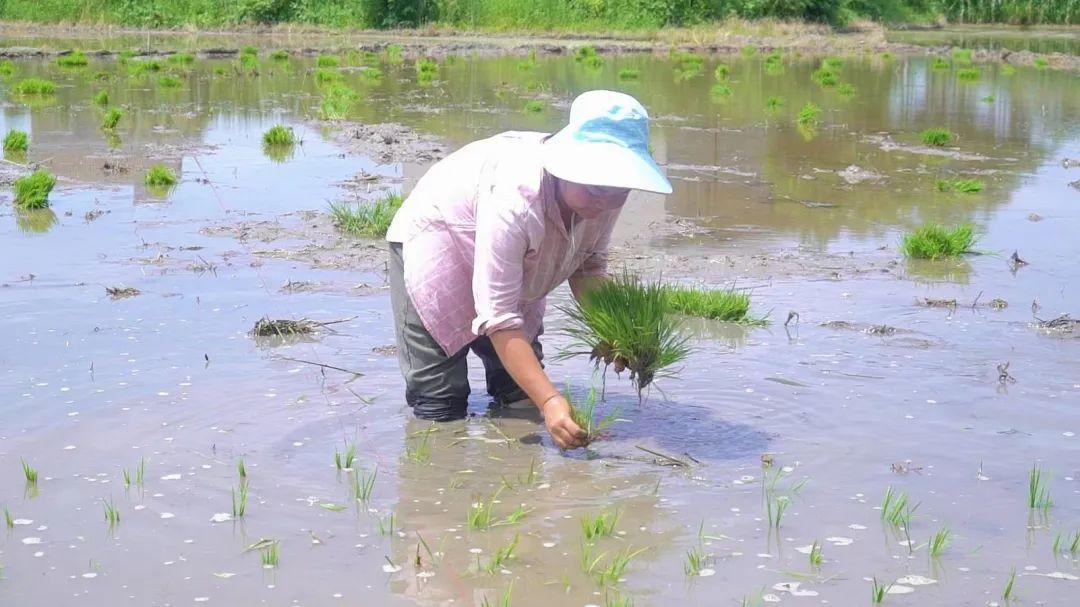 7月14日一早,臨澧縣新安鎮(zhèn)李家溶村,鄧桂香已經(jīng)在田里和工人們一起忙碌了很久,她五點(diǎn)鐘就起了床,帶領(lǐng)著雇傭的工人們一起下田,安排好每個(gè)人要干的活,自己也挽起褲腿踩在水田里,左手拿著一大捧嫩綠的秧苗,右手麻利地將一小撮一小撮的秧苗插進(jìn)水田。她戴著一頂淺藍(lán)色的遮陽(yáng)帽,即使這樣圓圓的臉也被曬得通紅,豆大的汗珠從臉頰上淌下來(lái),濕漉漉的泥土掛滿了她的小腿。