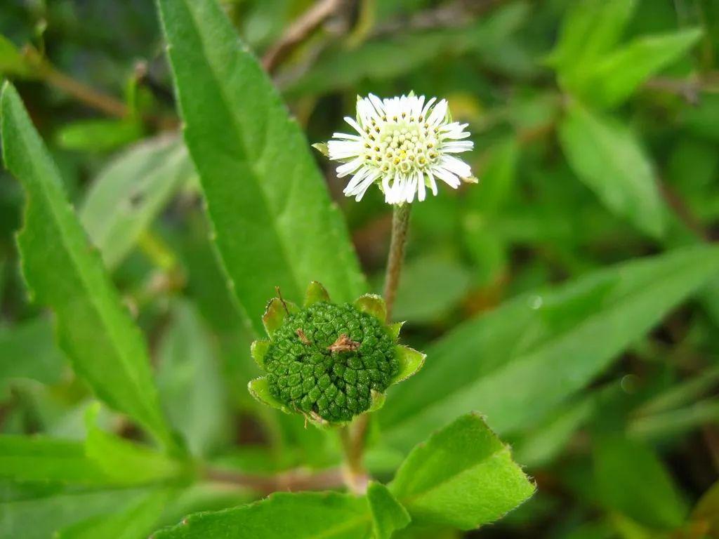 墨旱蓮,別名有鱧腸、旱蓮草、金陵草、墨頭草、黑口草、墨煙草、蓮子草、猢孫頭、豬牙草、墨菜等。墨旱蓮古稱“鱧腸”,早記載于《唐本草》。據(jù)《本草綱目》記載:鱧,烏魚也,其腸亦烏。此草柔莖,斷之有墨汁出,故名,俗稱墨菜是也,細(xì)實頗如蓮房狀,故得蓮名。