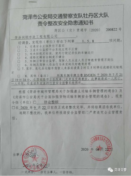 8月22日,菏澤市交通警察支隊(duì)牡丹區(qū)大隊(duì)約談菏澤同順市政工程有限公司負(fù)責(zé)人,強(qiáng)調(diào)駕駛的重要性,要求公司落實(shí)主體責(zé)任主體,加強(qiáng)交通知識(shí)培訓(xùn)工作,并對(duì)肇事車輛魯RM3836號(hào)渣土運(yùn)輸貨車在行駛報(bào)警系統(tǒng)損壞的情況下依然從事貨物運(yùn)輸行為提出整改意見。要求菏澤同順市政工程有限公司舉一反三杜絕類似問題再次發(fā)生,約談會(huì)當(dāng)場(chǎng)向菏澤同順市政工程有限公司下達(dá)責(zé)令整改隱患通知書責(zé)令同順市政工程有限公司停業(yè)整頓。