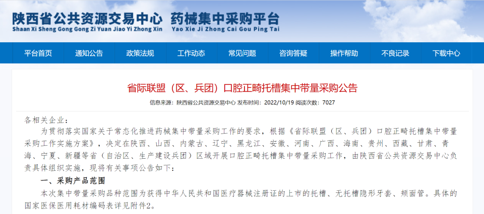 據(jù)陜西省公共資源交易中心10月19日消息,由陜西牽頭實(shí)施的15省份口腔正畸托槽集采正式開(kāi)啟,采購(gòu)品種范圍包括獲得中國(guó)醫(yī)療器械注冊(cè)證的上市的托槽、無(wú)托槽隱形牙套等。