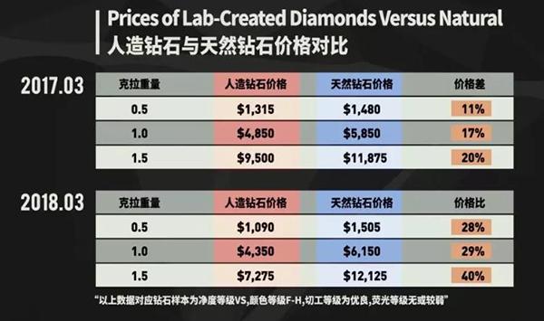 2017年,合成鉆石的平均售價只比天然鉆石便宜 10~20%,一年之后,這個差距已經(jīng)拉開到 30~40%。
