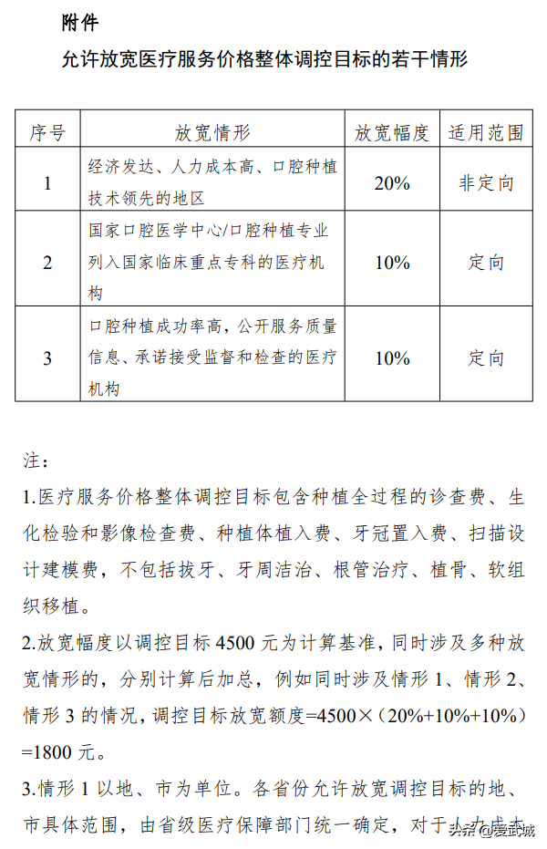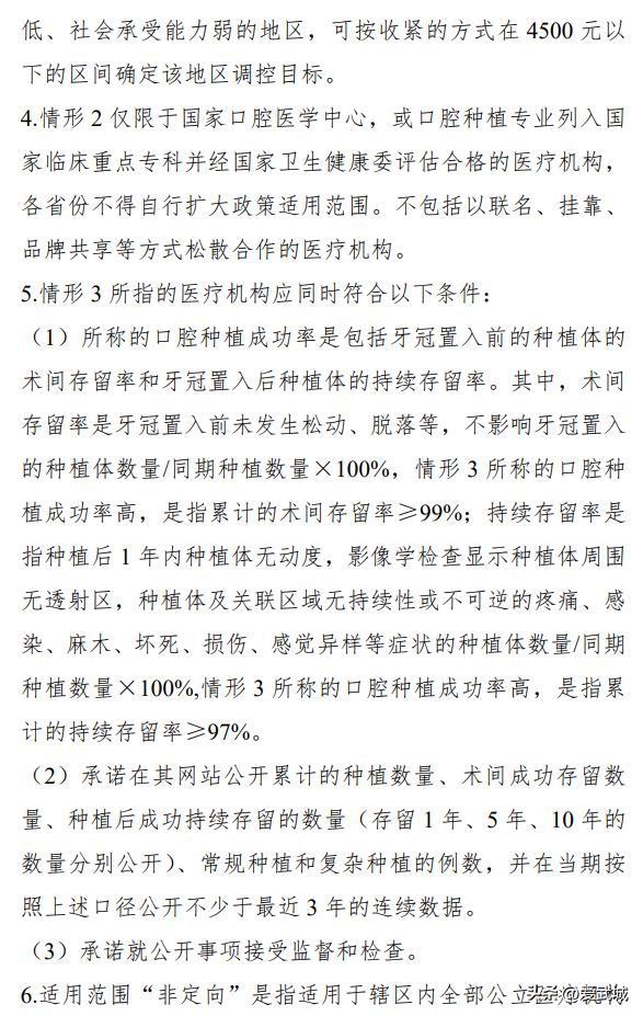 (四)圍繞種植牙全流程做好價(jià)格調(diào)控工作。各級(jí)醫(yī)療保障部門要以單顆常規(guī)種植牙的醫(yī)療服務(wù)價(jià)格為重點(diǎn),按照“診查檢查+種植體植入+牙冠置入”的醫(yī)療服務(wù)價(jià)格實(shí)施整體調(diào)控(詳見附件),目前三級(jí)公立醫(yī)療機(jī)構(gòu)完成全流程種植,醫(yī)療服務(wù)價(jià)格整體普遍高于4500元每顆的地區(qū),應(yīng)采取針對(duì)性措施,導(dǎo)入至整體不超過4500元每顆的新區(qū)間,三級(jí)以下公立醫(yī)療機(jī)構(gòu)的調(diào)控目標(biāo)參照當(dāng)?shù)蒯t(yī)療服務(wù)分級(jí)定價(jià)的政策相應(yīng)遞減。鼓勵(lì)有條件的地區(qū)在調(diào)控目標(biāo)范圍內(nèi)進(jìn)一步采取談判協(xié)商、成本監(jiān)審等措施降價(jià),進(jìn)一步擴(kuò)大調(diào)控果惠及群眾。當(dāng)前醫(yī)療服務(wù)價(jià)格整體已普遍低于4500元每顆的地區(qū),鼓勵(lì)維持現(xiàn)行低價(jià)。允許經(jīng)濟(jì)發(fā)達(dá)、人力等成本高的地區(qū)根據(jù)本地實(shí)際放寬醫(yī)療服務(wù)價(jià)格調(diào)控目標(biāo),放寬比例不超過20%;鼓勵(lì)地方對(duì)于口腔種植高等特定情形的醫(yī)療機(jī)構(gòu),探索定向?qū)捤傻目谇环N植醫(yī)療服務(wù)價(jià)格整體調(diào)控政策(詳見附件)。各省級(jí)醫(yī)療保障部門結(jié)合醫(yī)療服務(wù)價(jià)格整體調(diào)控要求,以及種植體集采、牙冠競(jìng)價(jià)的結(jié)果,合并制定并公開本地區(qū)種植牙全流程價(jià)格調(diào)控目標(biāo)(含種植體、牙冠、醫(yī)療服務(wù)),采取針對(duì)性的落實(shí)舉措。