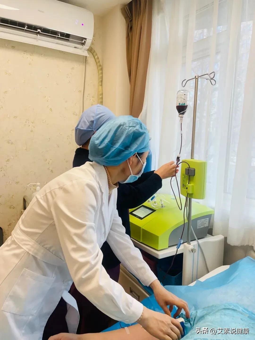 在無菌條件下,醫(yī)生通過一臺微電腦操控的設備,抽取人體一定量的靜脈血, 注入到有抗凝劑的滅菌容器里,然后,醫(yī)生通過設備發(fā)出指令,向容器內(nèi)注入醫(yī)用三氧混合氣體,與血液混合后,重新回輸入人體靜脈中。