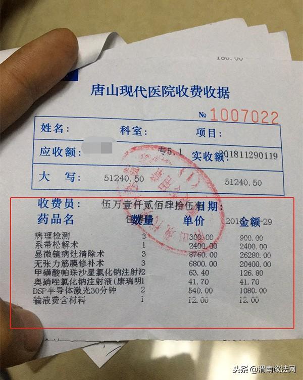 辛余提供的其中一張收費收據顯示,此次在唐山現(xiàn)代醫(yī)院診療中共8項收費項目,總計51240.5元。其中,“顯微鏡病灶清除術”單價8760元,做了3次,共26289元;“無張力筋膜修補術”單價6800元,做了3次,共20400元。