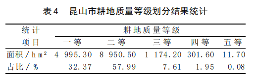 由表4可知,昆山市耕地質(zhì)量等級(jí)以二等和一等為主,其中耕地質(zhì)量為一等的面積達(dá)4 995.3 hm2,占總面積的 32.37%;耕地質(zhì)量為二等的面積達(dá)8 650.5 hm2,占總面積的 57.99%;耕地質(zhì)量為三等、四等、五等的面積分別為1 174.2、301.6、11.7hm2。同時(shí),通過綜合分析,昆山市耕地質(zhì)量整體上表現(xiàn)為東南部區(qū)域好于西北部區(qū)域,一等耕地主要分布于東南部的千燈鎮(zhèn)、淀山湖鎮(zhèn)和錦溪鎮(zhèn),二、三等耕地各鎮(zhèn)均有分布,四等耕地主要位于玉山鎮(zhèn)(昆山高新區(qū))西部和花橋開發(fā)區(qū)東部,五等耕地主要位于花橋開發(fā)區(qū)東部。玉山鎮(zhèn)(昆山高新區(qū))西部和花橋開發(fā)區(qū)東部的耕地質(zhì)量等級(jí)較低,分析其原因主要與土地平整、養(yǎng)殖魚塘復(fù)墾及土壤重金屬污染有關(guān)。