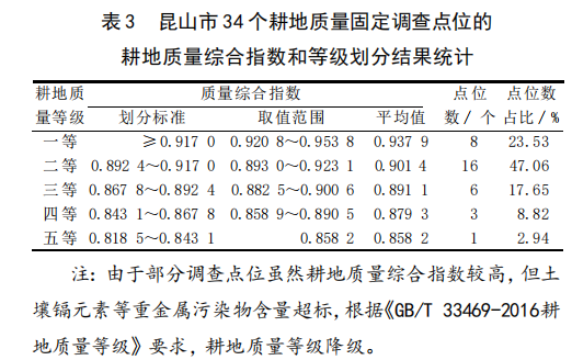 采用《GB/T 33469-2016 耕地質(zhì)量等級(jí)》和《全國(guó)耕地質(zhì)量等級(jí)評(píng)價(jià)指標(biāo)體系》推薦的方法對(duì)昆山市34個(gè)耕地質(zhì)量固定調(diào)查點(diǎn)位進(jìn)行了質(zhì)量綜合指數(shù)計(jì)算與等級(jí)劃分,具體結(jié)果見表 3。由表 3可知,昆山市34個(gè)耕地質(zhì)量固定調(diào)查點(diǎn)位的耕地質(zhì)量綜合指數(shù)介于 0.858 2~0.953 8,平均值為 0.904 9。耕地清潔程度調(diào)查與評(píng)價(jià)是耕地質(zhì)量綜合評(píng)價(jià)的重要組成部分之一。同時(shí),昆山市34個(gè)耕地質(zhì)量固定調(diào)查點(diǎn)位的耕地清潔程度評(píng)價(jià)結(jié)果表明,在34個(gè)固定調(diào)查點(diǎn)位中,有 3 個(gè)調(diào)查點(diǎn)位的土壤污染等級(jí)為尚清潔,3個(gè)調(diào)查點(diǎn)位的土壤污染等級(jí)為輕度污染,這 6 個(gè)點(diǎn)位的污染物類型皆為鎘。根據(jù)《GB/T33469-2016耕地質(zhì)量等級(jí)》要求,這些調(diào)查點(diǎn)位的耕地質(zhì)量等級(jí)降級(jí)。