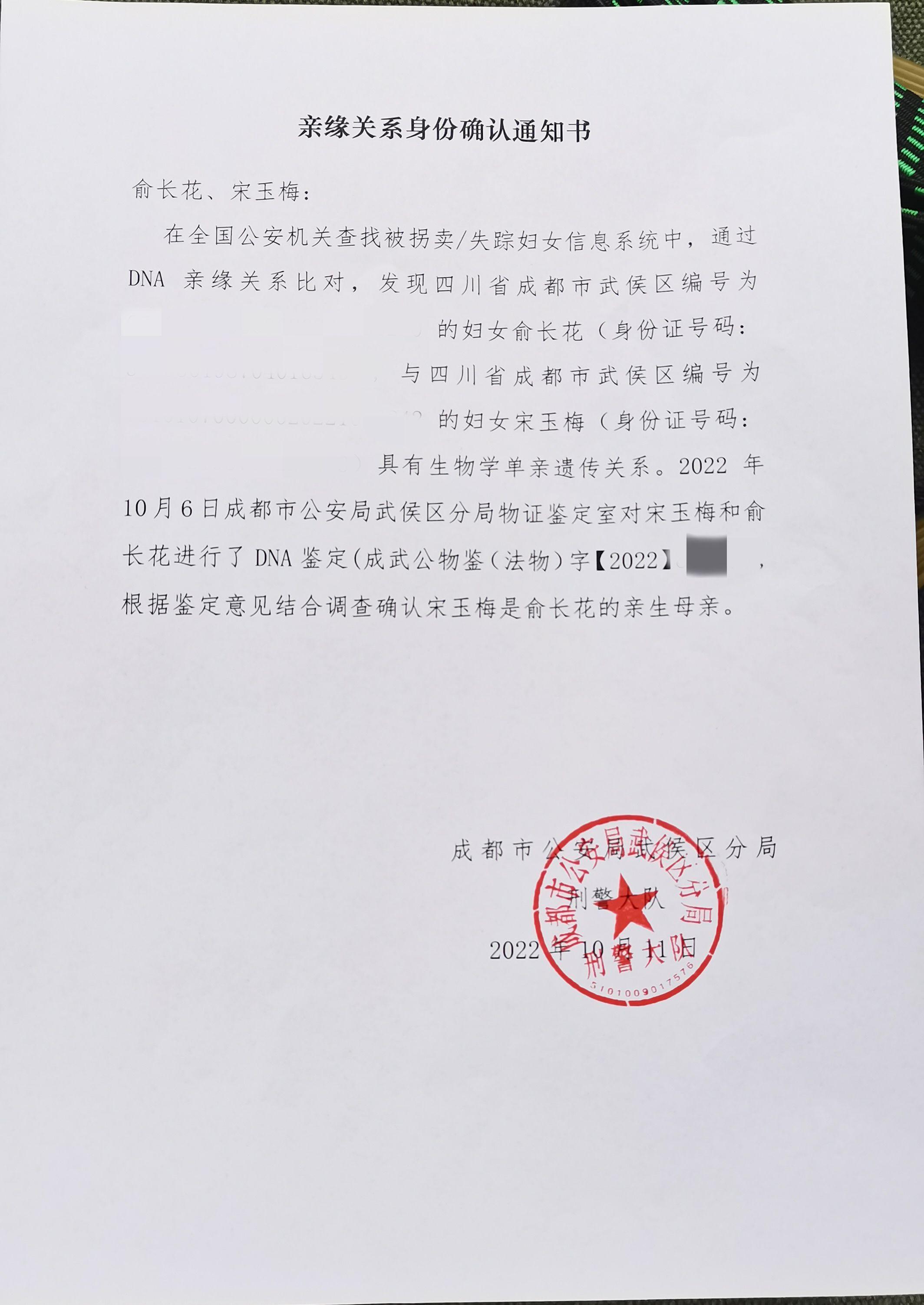 10月12日,俞長花在派出所領取了《親緣關(guān)系身份確認通知書》。受訪者供圖