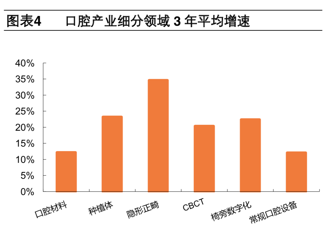 種植、正畸、CBCT 及椅旁數(shù)字化景氣度高。從口腔醫(yī)療患者就診結(jié)構(gòu)來(lái)看,牙齒種植患者占比 40.02%,比例高,其次是牙齒正畸及頜內(nèi)正畸,占比 29.88%,兩者合計(jì)占比約 70%,發(fā)展勢(shì)頭 迅猛。根據(jù)《視野下的中國(guó)口腔產(chǎn)業(yè)趨勢(shì)報(bào)告》,口腔上游細(xì)分領(lǐng)域中,種植體、隱形正畸、CBCT 和椅旁數(shù)字化保持高景氣度,3 年增速均值分別為 23.17%、34.59%、20.36%和 22.34%。